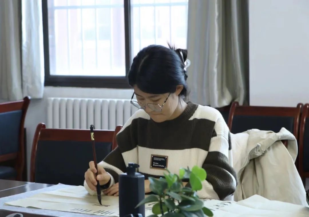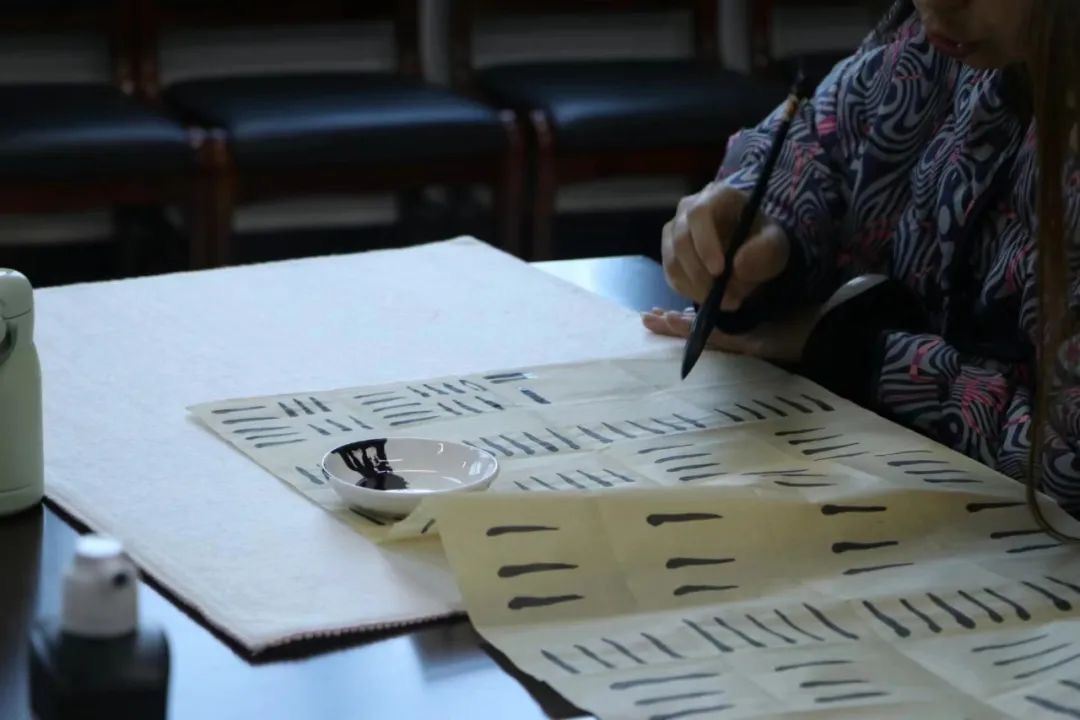 周双老师带领同学们分析隶书,隶书有“蚕头燕尾”、“一波三折”的特点。随后与同学们探讨了《曹全碑》字帖的历史起源及其字体用笔,字帖主要以圆笔为主,力求用笔方圆兼备。周双老师拿起毛笔亲手传授同学们书法学习经验。内容包括从如何开笔再到一横一竖书写,同学们专心致志,仔细揣摩,反复练习,认真品味着汉字的魅力。