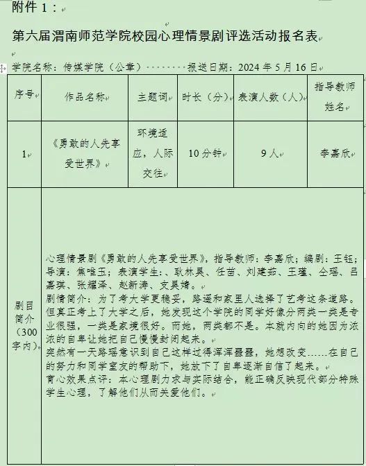 按照第六届好博体育官方校园心理情景剧大赛要求,好博体育积极选拔优秀剧本参赛,精心打磨剧本。最终推选2022级戏剧影视美术设计专业员工自导自演的作品《勇敢的人先享受世界》代表公司参与评选,并晋级复赛。