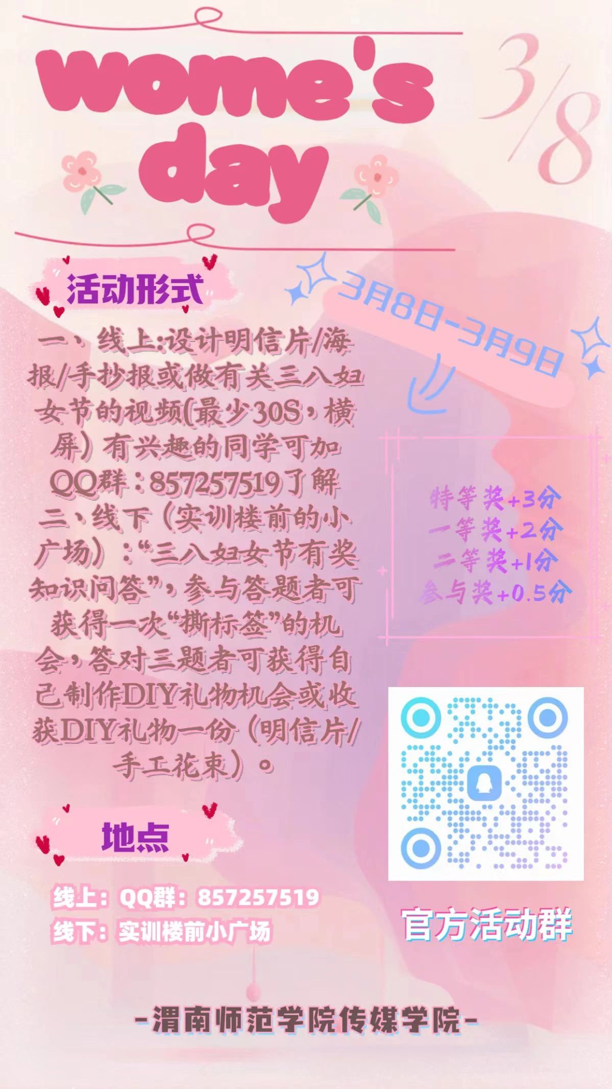 一、线上: 设计明信片/海报/手抄报或做有关三八妇女节的视频(最少30S,横屏)有兴趣的同学可加QQ群:857257519了解。